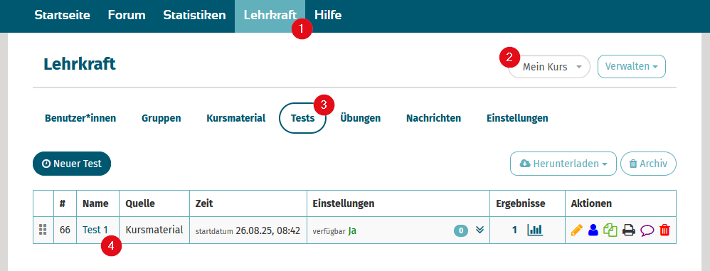 - Erstellen Sie wie gewohnt einen Test oder wählen Sie einen bereits vorhandenen Test (4) aus.