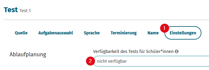 - Verfügbarkeit des Tests für Schüler*innen (im Abschnitt Ablaufplanung): Hier machen Sie den Test über ein Dropdown verfügbar, sonst wird er nicht auf der Startseite der Schüler*innen angezeigt, auch wenn das Startdatum erreicht ist.