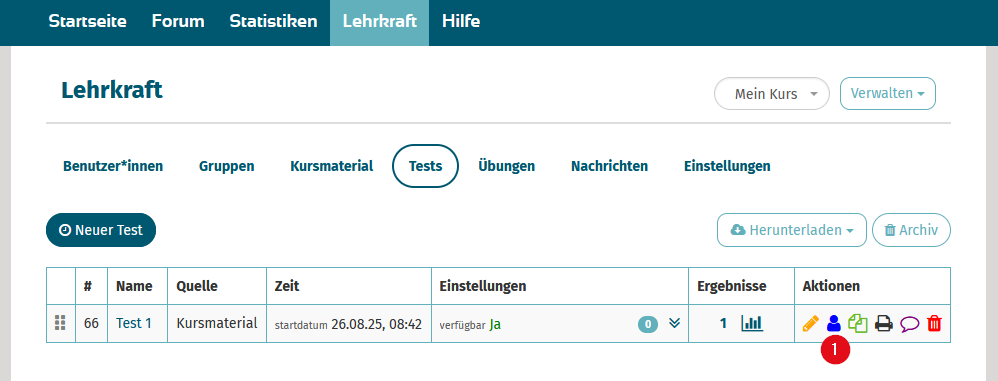 - Klicken Sie beim gewünschten Test auf das blaue Symbol (1), um zu den Testeinstellungen pro Schüler*in zu kommen.
