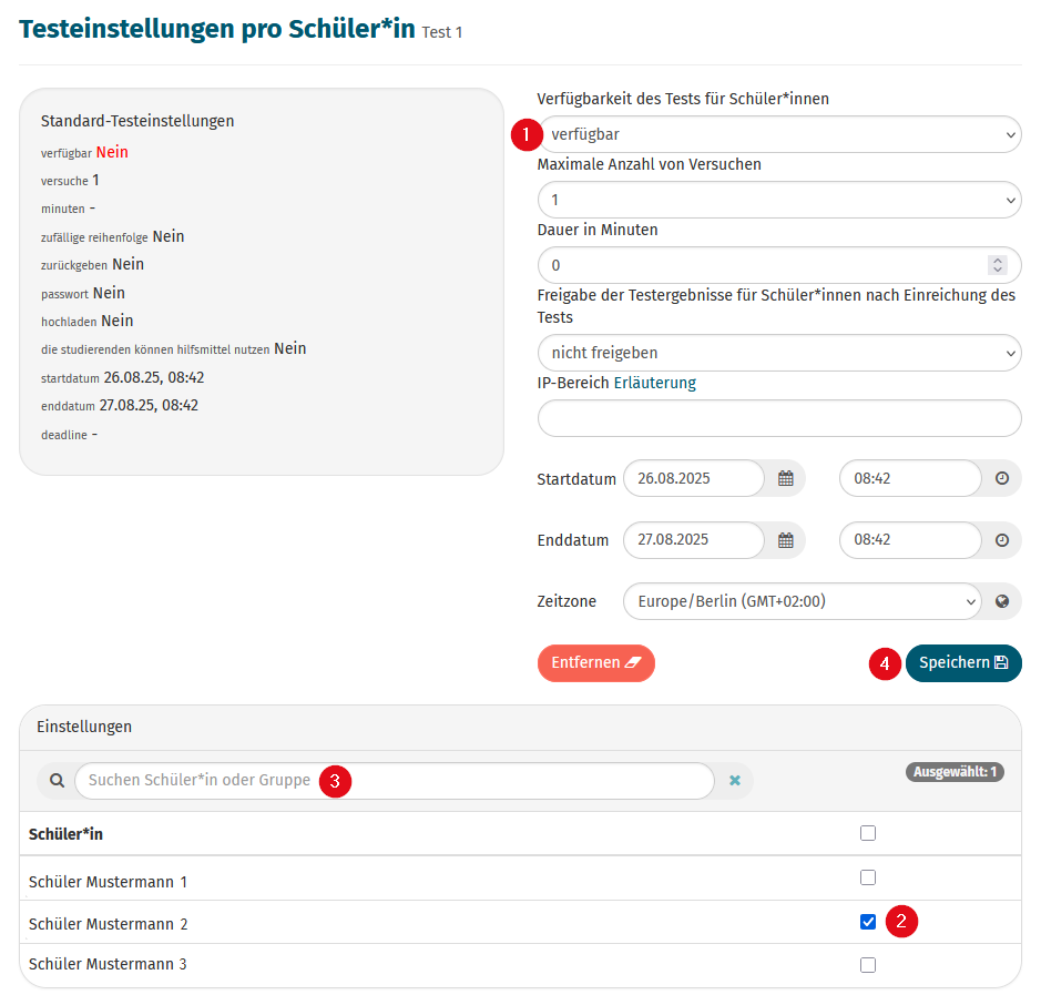 - Setzen Sie die Verfügbarkeit auf „verfügbar“ (1) und wählen Sie unten auf der Seite die Schüler*innen (2) oder Gruppen aus, die Zugriff auf den Test haben sollen. Um Schüler*innen bzw. Gruppen schneller zu finden, können Sie deren Namen auch suchen (3).