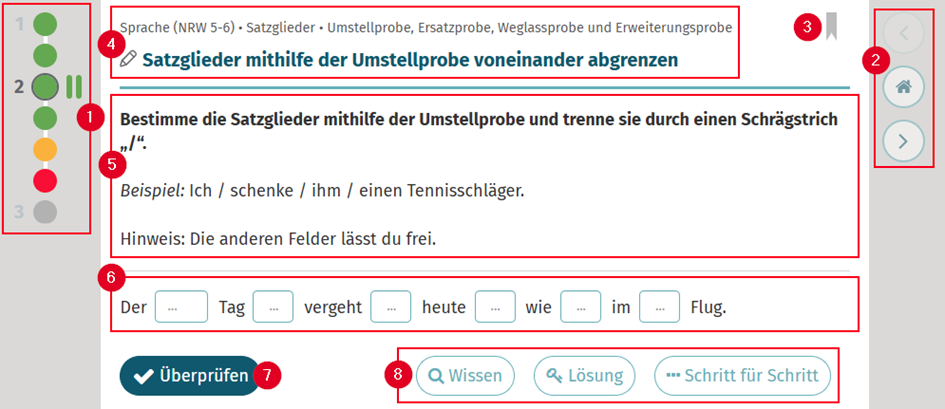 • Am linken Rand (1) werden zu den Aufgaben des Kapitels Informationen zur Aufgabenstruktur und zum Bearbeitungstatus angezeigt. Der Kreis zeigt den Status der Hauptaufgabe an, die Striche rechts daneben den Status der Schritte der zugehörigen Schritt-für-Schritt-Lösung(falls bei der Aufgabe vorhanden). Gleichzeitig dienen die Kreise zur Navigation zur zugehörigen Aufgabe. Gleichzeitig dienen die Kreise der Navigation zur zugehörigen Aufgabe. Hat eine Aufgabe zwei oder mehr Kreise, besteht sie aus mehreren zusammengehörenden Teilaufgaben. Die Anzahl der Striche daneben zeigt an, wie viele Schritte die Schritt-für-Schritt-Lösung hat.
