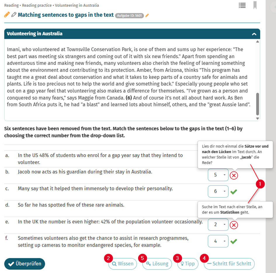 • Feedback (1): Wenn die Aufgabe bearbeitet und auf ÜBERPRÜFENgeklickt worden ist, wird ein direktes Feedback angezeigt.